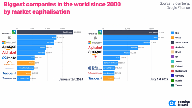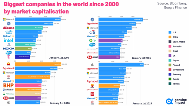 Just look at the following graphics that illustrate the top 10-largest market caps over the past two decades.