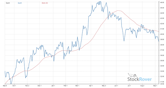 However, Corning stock is projected to skyrocket as the 5G rollout accelerates in the coming years. The company has already begun to experience increased returns. Over the past year, Corning has seen its sales increase by 22.8% and its earnings-per-share (EPS) surge by 678.6%. The company is expected to continue the trend, with a forecasted revenue growth rate of 22.4% in 2021. As a result, GLW has experienced a 21.7% climb in stock price over the past 12 months. The change in share price is displayed with a 50-day moving average below.