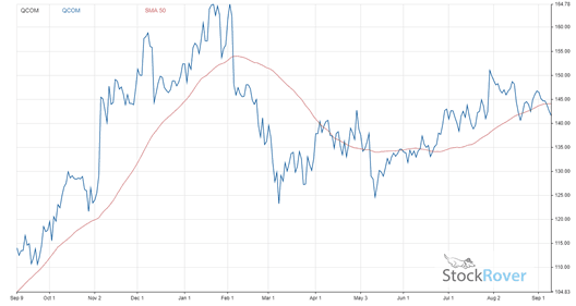 QCOM has seen a 29.0% increase in price over the past year, despite a drop in share price in February 2021 due to a more “bullish” Q2 2021 outlook due to supply shortages. The company is forecasted to experience a 36.3% increase in revenue this quarter (Q3 2021). The graph below depicts QCOM’s performance over the trailing 12 months, along with a 50-day moving average.