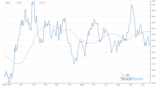 MYOV has seen a 26.6% increase in stock price over the past year due to its recent success. The growth has been graphed below along with a 50-day moving average.