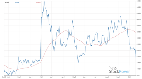 Novavax has exhibited solid financial performance even prior to COVID-19, with an average five-year sales growth rate of 136.9% and a return rate of 420.7% over the same period. However, the company is expected to skyrocket with the recent success of its influenza and COVID-19 vaccine trials. Novavax is forecast to experience a 211.7% year-on-year revenue growth in Q4 2021 and a 181.5% increase in sales in 2022. As a result, NVAX has encountered a 34.1% increase in its share price over the trailing 12 months, shown below alongside a 50-day moving average.
