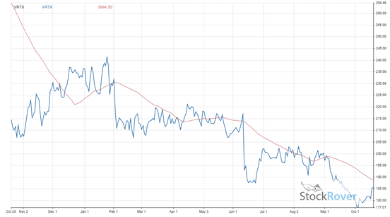 Unlike the other companies on this list, Vertex is a value play, not a growth investment. VRTX is down 15.9% on the year. The downward trend and a 50-day moving average are displayed below.