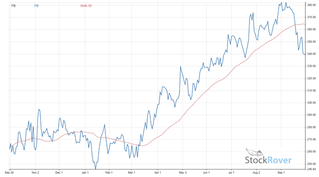 FB has seen a 29.6% increase in share price over 12 months, which is shown below alongside a 50-day moving average.
