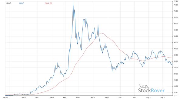 The significant growth of Riot Blockchain’s mining capabilities in the coming months, along with the decline of China’s crypto industry, has opened the door for the company to experience unimaginable growth. The company is forecasted to see a 1,681.2% jump in revenue in 2021, including a projected 1,611.2% year-on-year increase in Q4 2021. No, those numbers are not a typo. RIOT is projected to soar. As a result, the stock has seen an 880.5% skyrocket in price over the past year. The growth is shown below alongside a 50-day moving average.
