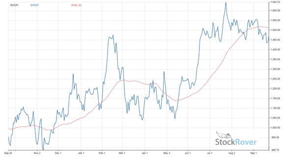 SHOP has seen its share price rise by 58.0% over the past 12 months, displayed below alongside a 50-day moving average.