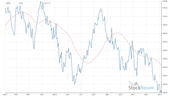 Apple has recently seen its share price fall significantly like other tech stocks. AAPL is down 30.4% over the past 12 months, shown below, with a 50-day moving average.