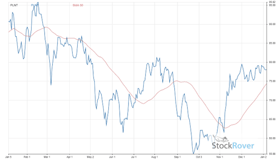 PLNT has fallen by 17.5% over the past year. However, the stock has rebounded by 25.7% over the last three months. The company’s share price over the previous year is graphed below alongside a 50-day moving average.