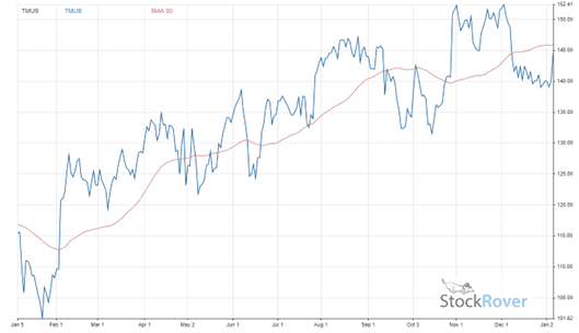 As a result of its positive financials and growth, T-Mobile has avoided the downturn that has plagued most of the stock market. TMUS has seen its share price jump by 26.7% over the trailing 12 months. The S&P 500 has produced a negative 20.6% return over the same period. T-Mobile’s share price movement over the last year is displayed below alongside a 50-day moving average.