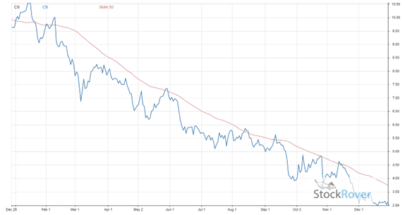 CS has seen its share price plummet by 68.0% over the past 12 months, with little signs of stopping. The company’s share price is graphed below, along with a 50-day moving average.