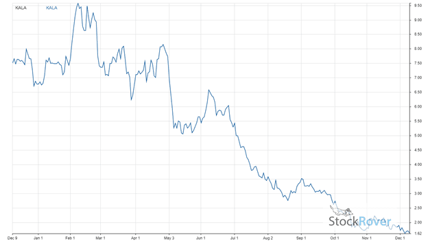 KALA has taken a beating over the last year in the stock market. The company’s share price has dropped by 78.2% over the past 12 months. KALA’s price movement over the previous 12 months is charted below alongside a 50-day moving average.