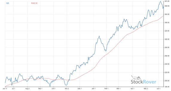 Goldman Sachs has managed to beat industry figures, with its stock price soaring by 93.9% over the past year on the backs of a 62.2% jump in revenue and a return rate of 98.4% over the trailing 12 months. The company has seen its EPS jump from $21.03 in 2019 to $24.74 in 2020 and is expected to shatter last year’s figures with an astounding EPS of $18.60 in Q1 2021 alone. GS’s stock price over the past year is shown below alongside a 50-day moving average.