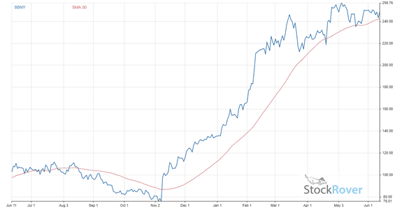 SBNY’s growth and upside potential have caused its share price to increase by 136.5% over the past year and by 84.8% so far this year. The change in share price over the past year and a 50-day moving average line are charted below.