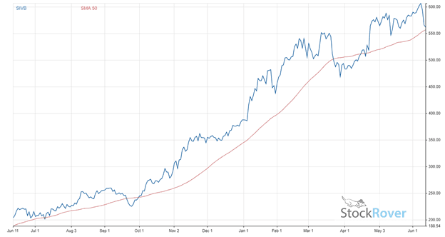 The company’s consistent ability to comfortably outperform the market has caused SIVB’s share price to surge by 429.3% over the last five years and by 153.3% over the past 12 months. The stock’s one-year growth alongside a 50-day moving average is displayed below.