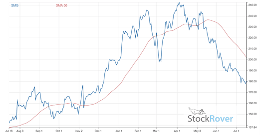 Scotts’ share price for the trailing 12 months is plotted below alongside a 50-day moving average. Despite the decrease in the stock price in recent months, SMG has seen a 25.7% jump in price over the past year.