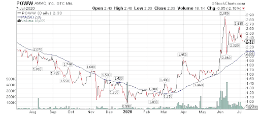 Woods told me he likes small-cap ammunition maker AMMO, Inc. (POWW) as his top recommendation among gun stocks to buy. Shares in the stock have risen nearly 200% so far this year, he added.