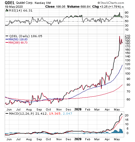 Quidel Corp. (NASDAQ: QDEL), a San Diego-based provider of rapid diagnostic testing solutions, cellular-based virology assays and molecular diagnostic systems, soared 109.58% between when it was recommended in the Home Run Trader advisory service on March 23 and the close of trading on May 19. The share price of Quidel has jumped amid reports that the company could become at least part of the solution to improve testing for the novel coronavirus that had led to 4,985,825 cases and 324,889 deaths globally, along with 1,570,583 cases and 95,553 deaths in the United States, as of May 19.