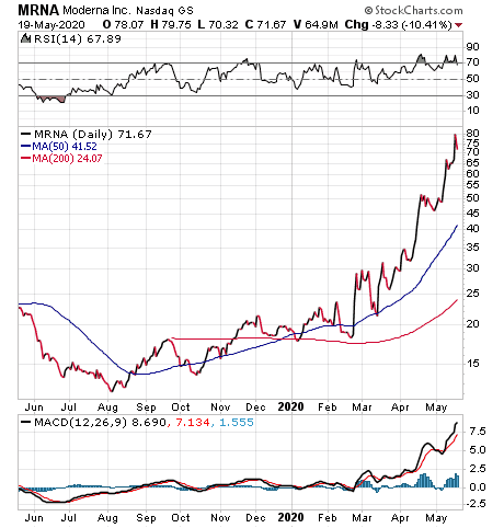 The S&P 500 rose 3.2% on Monday, May 18, bouncing back after losses the previous week. Part of the recovery came from encouraging words on May 17 by Fed Chairman Jerome Powell on the 60 Minutes television program and an announcement of early testing success in an experimental coronavirus vaccine from Moderna (NASDAQ:MRNA), of Cambridge, Massachusetts. Even though the stock more than doubled in price since April, it pulled back 10.41% on May 19 after a media report indicated the results were not as encouraging as first may have been portrayed.