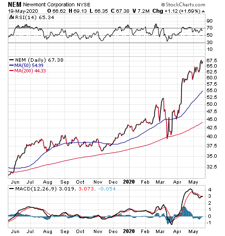 Newmont Corporation (NYSE: NEM) is an ascending gold mining stock that may interest investors who want exposure to precious metals. NEM offers a current yield of 1.01%, while its share price jumped 55.40% so far in 2020 to beat gold’s 33.59% return during that period.