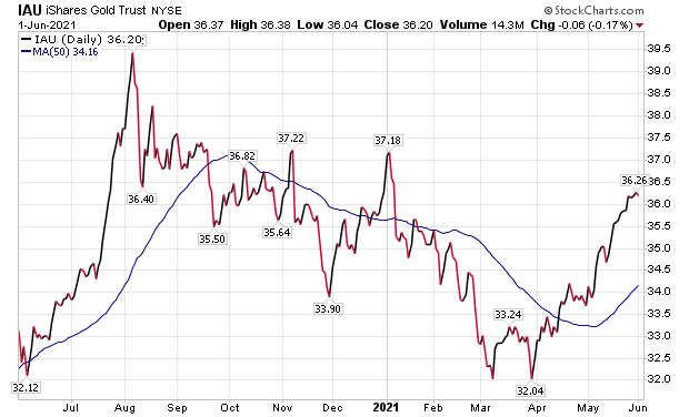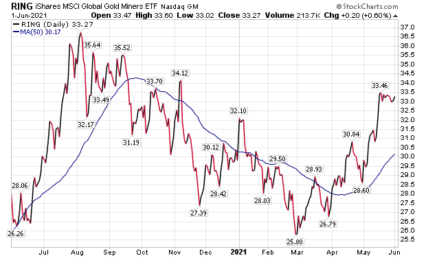 “Investors who want to seek these leveraged gains should invest in a diversified mutual fund or ETF,” Carlson said. “Those who want an inflation hedge should choose a fund focused on gold mining companies. A good choice is iShares MSCI Global Gold Miners (RING).”