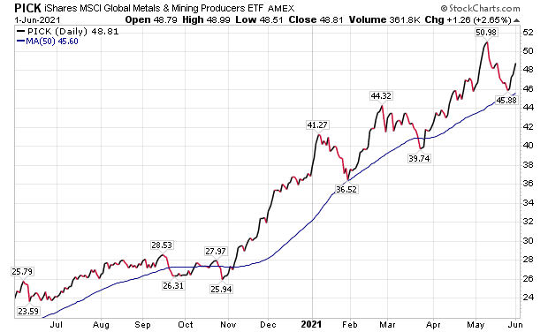 For investors who want a broader portfolio that will benefit from both inflation and global growth, consider iShares MSCI Global Metals & Mining Producers (PICK), Carlson counseled.