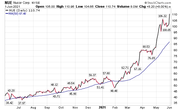 One metals stock that has been on a huge run in the past year with no signs of stalling is Nucor Corp. (NYSE:NUE), a Charlotte, North Carolina based producer of steel and related metals.