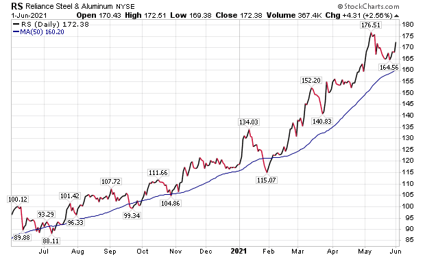 Reliance Steel’s stock price has jumped 78.7% in the past 52 weeks and 45.1% thus far in 2021. Value-oriented investors may be interested that the company’s price-to-earnings ratio of 19.5 is roughly half that of the S&P 500 Index’s 36.5.