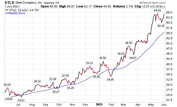 The stock price of Steel Dynamics has jumped 143.9% in the past 52 weeks and 75.6% in 2021, as of June 1. The company’s price-to-earnings ratio of 17.0 is less than half the S&P 500 Index’s 36.5.