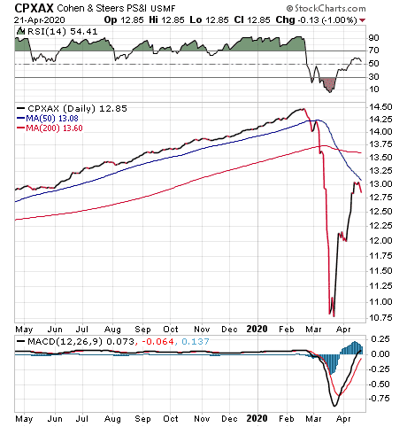 A third recommendation from Carlson is Cohen & Steers Infrastructure (NYSE:UTF), which had been selling at around a 5% to 6% discount to net asset value for a while. During the market panic, the share price fell more sharply than the net asset value and the fund sold at a significant discount.