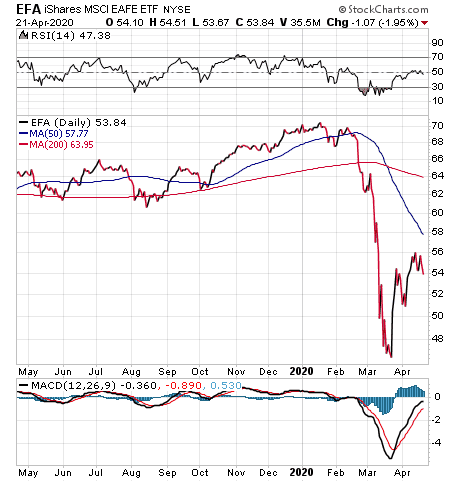 As for international stocks, the use of the iShares MSCI EAFE ETF (NYSE:EFA) as a proxy for those equities signals its all-time closing high on Jan. 2, followed by a recent low on March 23. During that time, EFA dove a harrowing 33.70%.