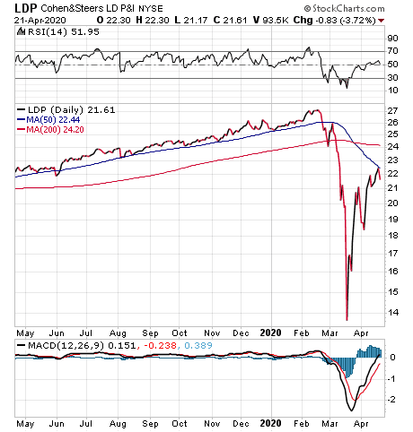 Another fund recommended by Carlson is Cohen & Steers Limited Duration Preferred & Income (NYSE:LDP), featuring a dividend yield of 8.34%. Before the stock market crash in March, the closed-end fund was priced around its asset value in the previous months, selling at either small discounts or premiums to net asset value (NAV), he added.
