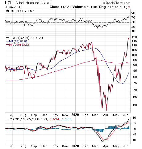 A “better bet at this point” is on the key component suppliers to all the RV companies: Patrick Industries (NASDAQ:PATK) and LCI Industries (NYSE:LCII), both of Elkhart, Indiana, said Carlson, who also leads the Retirement Watch advisory service. Both pay dividends, with Patrick Industries providing a current yield of 1.60%, while LCI Industries is offering 2.18%.