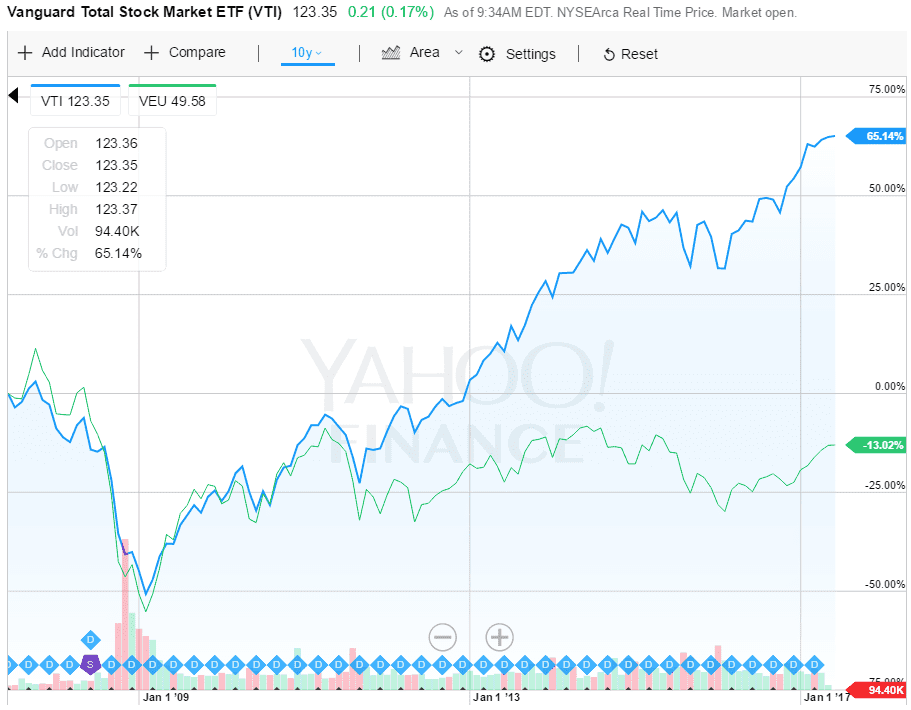 Vanguard Total Stock Market ETF (VTI) versus Vanguard FTSE All-World ex-US ETF (VEU) over 10 Years