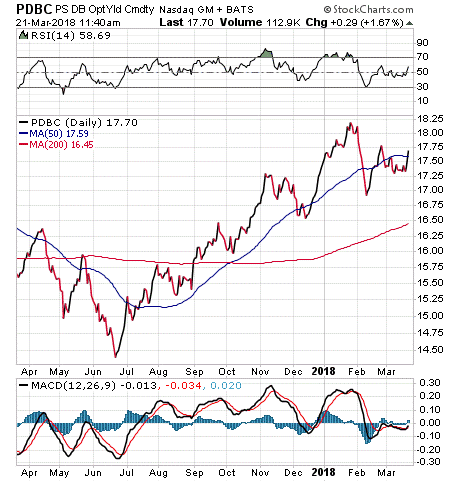 PDBC’s top commodity holdings are WTI Crude, 4.41%; Brent Crude, 4.16%; NY Harbor ULSD, 3.93%; Gasoline, 3.87%; and Gold, 2.64%.