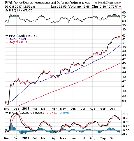 The PowerShares Aerospace & Defense ETF (PPA) is a smaller exchange-traded fund (ETF) than the two “big guns” in the aerospace and defense sector — the SPDR S&P Aerospace & Defense ETF (XAR) and the iShares U.S. Aerospace and Defense ETF (ITA) — but the mighty mite has generated some substantial returns this year.