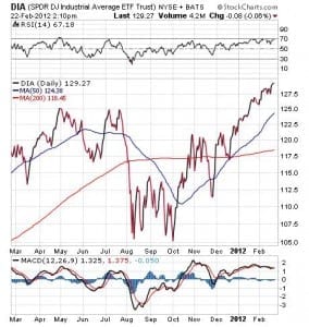 On Feb. 12, DIA closed at $129.23 per share, after paying a dividend of 0.332. The last time the fund topped that level occurred on May 19, 2008, when the fund closed at $130.23 per share. The ETF’s rising share price may have been aided by positive fourth quarter and full-year 2011 results from Home Depot, Inc. (HD) and other companies that are doing well during a weak economy. Indeed, HD is DIA’s 16th largest holding, as of yesterday’s close.