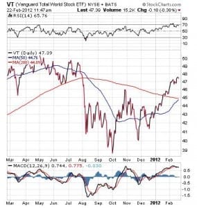 Now, technically speaking, the major U.S. indices now trade well above both their 50- and 200-day moving averages. However, it’s not just U.S. markets that have powered higher in 2012. If we take a look at the chart below of the Vanguard Total World Stock ETF (VT) — a fund pegged to the price and yield performance of the über-broad FTSE Global All Cap Index — we see that this measure of the global markets also is trading above its 50- and 200-day moving averages.