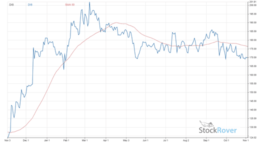 Driven by its streaming services, Disney is projected to experience strong growth for the foreseeable future. Company sales are expected to grow by 12.4% in Q4 2021 and by 25.6% in 2022. As a result, DIS has seen its share price surge by 41.6% over the past year. The upward trend in stock price is displayed below alongside a 50-day moving average.
