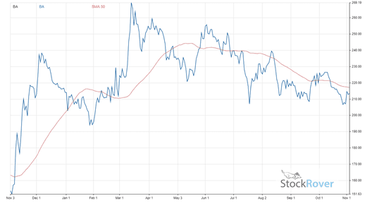 BA already has seen its share price rebound by 43.6% over the past 12 months. With the company forecasted to increase its revenue by 30.6% in Q4 2021 and 35.6% in 2022, BA will only increase further in value. Boeing’s stock price over the past year is graphed below, along with a 50-day moving average.