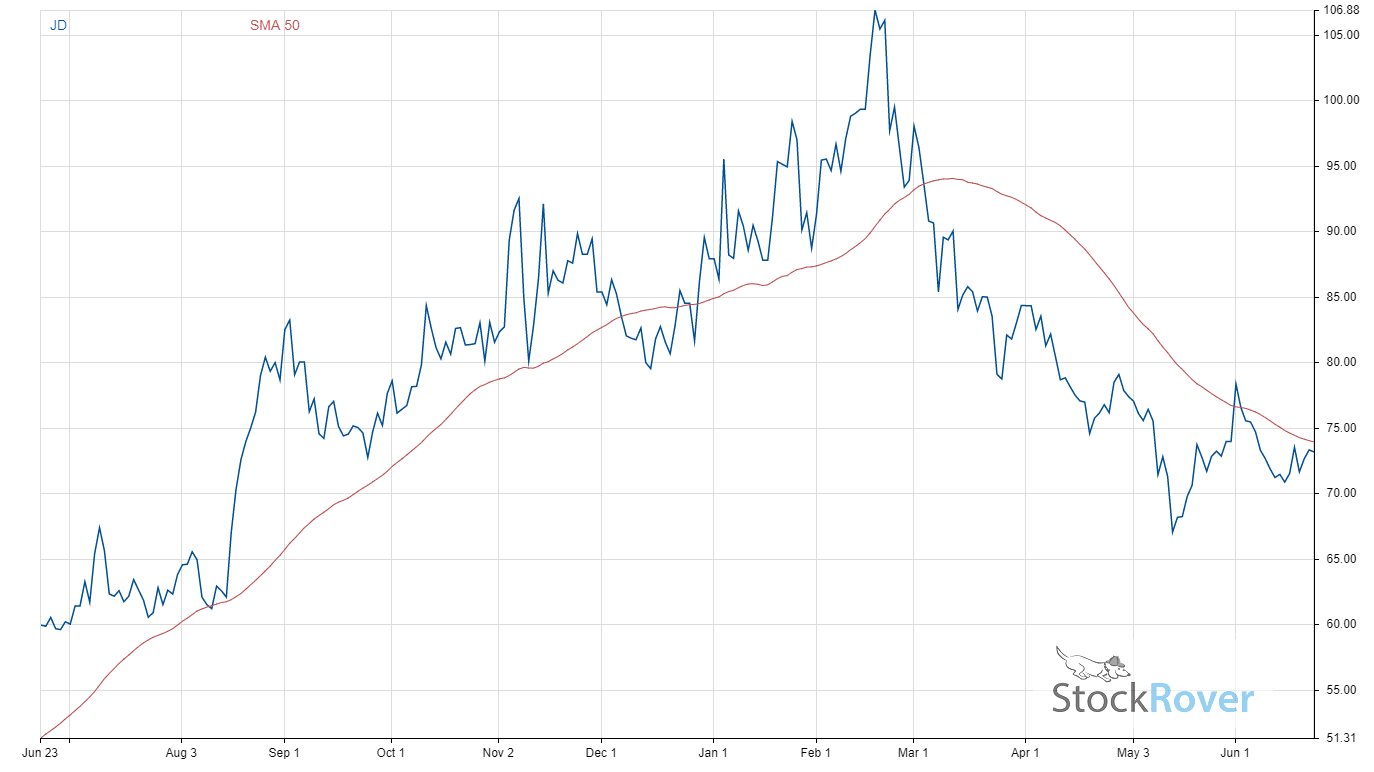 JD is currently up 23.8% over the past year. With shares down by 44.9% from their all-time high in mid-February 2021, there is no better time to buy than now. The company’s stock price is charted below alongside a 50-day moving average to better display change.