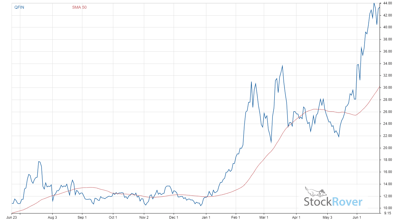 As a result, QFIN stock has soared by 299.7% over the past year and by 267.5% so far this year. This change, as well as a 50-day moving average line, are charted below.