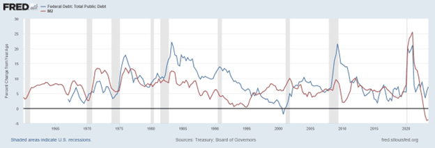 The graphic below shows the percentage change year-over-year for the Federal Debt (blue line) and the M2 Money Supply (red line).