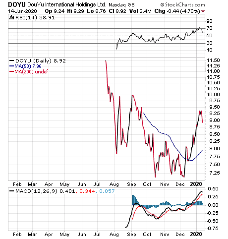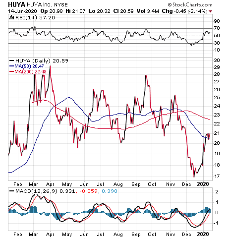 Publicly traded companies in China that are involved in live streaming video games include DouYu International Holdings Ltd. (NASDAQ:DOYU), a platform that also is a pioneer in esports, and Huya (NYSE:HUYA), which went public in May 2018 and has arranged content partnerships with several esports organizers, game developers and publishers. The two companies account for 60 percent of China’s game-streaming and Motley Fool recently cited Huya’s “attractive valuation” with a forward price-to-earnings (P/E) multiple of 21.5, even though Wall Street analysts’ consensus is for the company to grow 79.5 percent in 2019.
