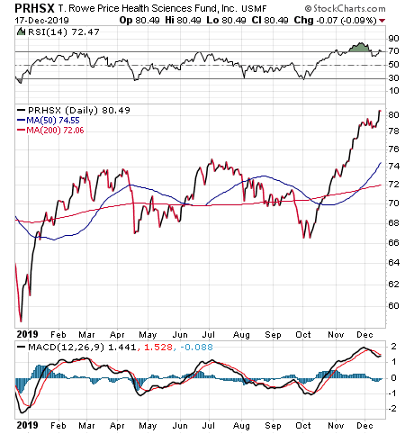 “I recommend using funds,” Carlson said. “Among active mutual funds, there aren’t any that specialize in the subsector. The best choice is T. Rowe Price Health Sciences (MUTF:PRHSX). The largest sector in the portfolio is biotechnology, which is about 35 percent of the fund. The fund is almost always among the top quarter of health care funds ranked by Morningstar.”