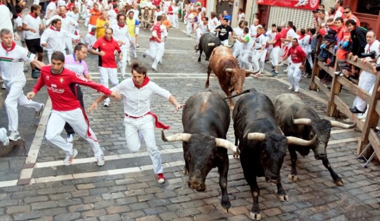 The Running of the Bulls, or “encierro” in Spanish, is a practice that involves masses of people running in front of a group of stampeding toro bravo cattle that have been let loose on a sectioned-off subset of a town’s streets. The most famous event of this kind is the eight-day festival of Sanfermines in Pamplona.