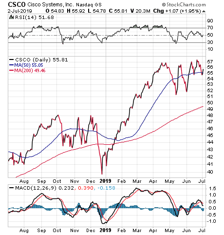 “The trade conflict with China was the only thing holding back Cisco’s stock price the last few months,” said Bob Carlson, who heads the Retirement Watch investment advisory service. “The company’s doing well in a range of key technology sectors, sells at a reasonable valuation and has an attractive dividend yield. If the trade conflicts are on the way to being resolved, only a recession would hold down the stock’s price.”