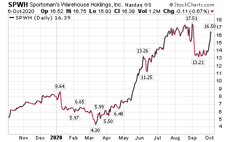 Carlson counseled that investors should consider Sportsman’s Warehouse Holdings (NASDAQ:SPWH) as possibly the only major retailer left that will sell guns and ammunition, since Wal-Mart (NYSE:WMT) and Dick’s Sporting Goods (NYSE:DKS) stopped doing so. About half the company’s sales are from guns and related accessories, Carlson added.