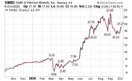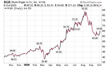 Bryan Perry, who leads the Cash Machine investment newsletter and the Premium Income, Quick Income Trader, Breakout Profits Alert and Hi-Tech Trader advisory services, told me he likes Smith & Wesson Brands Inc. (NASDAQ:SWBI), a Springfield, Massachusetts-based manufacturer of firearms and ammunition, along with Sturm Ruger & Co. (NYSE:RGR), a Southport, Connecticut, gun maker. The latter company provides firearms for hunting, target practice and home protection.