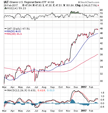 From the chart below, you can see that IAT started off the year slowly, but has rallied to new highs following the Nov. 8 election. Expectations for the Fed’s interest hikes later this year are beneficial to regional banks and IAT, as well.