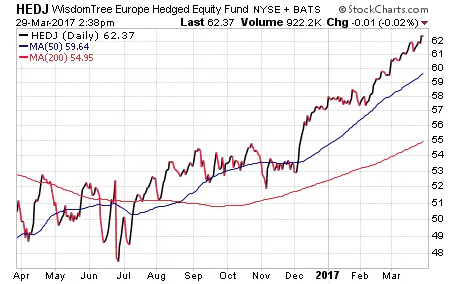 Although the fund is only eight years old, HEDJ has become a popular ETF, currently boasting about $9.6 billion in net assets. When compared to broader European ETFs, such as the Vanguard FTSE Europe ETF (VGK), HEDJ has outperformed nicely over the course of the past year. Year to date, HEDJ is up close to 8%, better than the roughly 6% rise in the S&P 500.