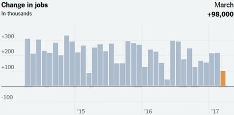 The Labor Department also revised down its estimates for job creation in January and February, with the combined total falling by 38,000. Average hourly earnings rose at an annual pace of 2.7% in March, following a 2.8% increase in February. The retail sector suffered the most in March, with almost 30,000 jobs cut. Big box department stores are expected to close at least 3,500 stores this year alone. It remains to be seen if the much-weaker-than-expected March jobs report was an aberration or a sign of things to come.